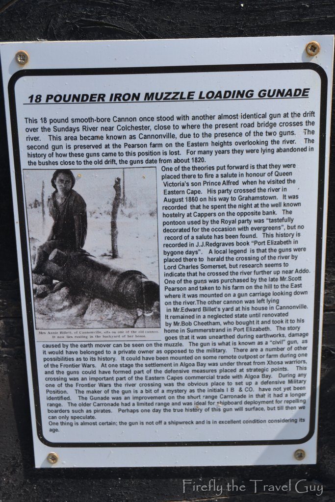 This 18-pound smooth-bore cannon once stood, with another almost identical gun, at the drift over the Sundays River near Colchester, close to where the present road bridge crosses the river. This area became known as Cannonville, due to the presence of the two guns. The second gun is preserved at the Pearson farm on the Eastern heights overlooking the river.