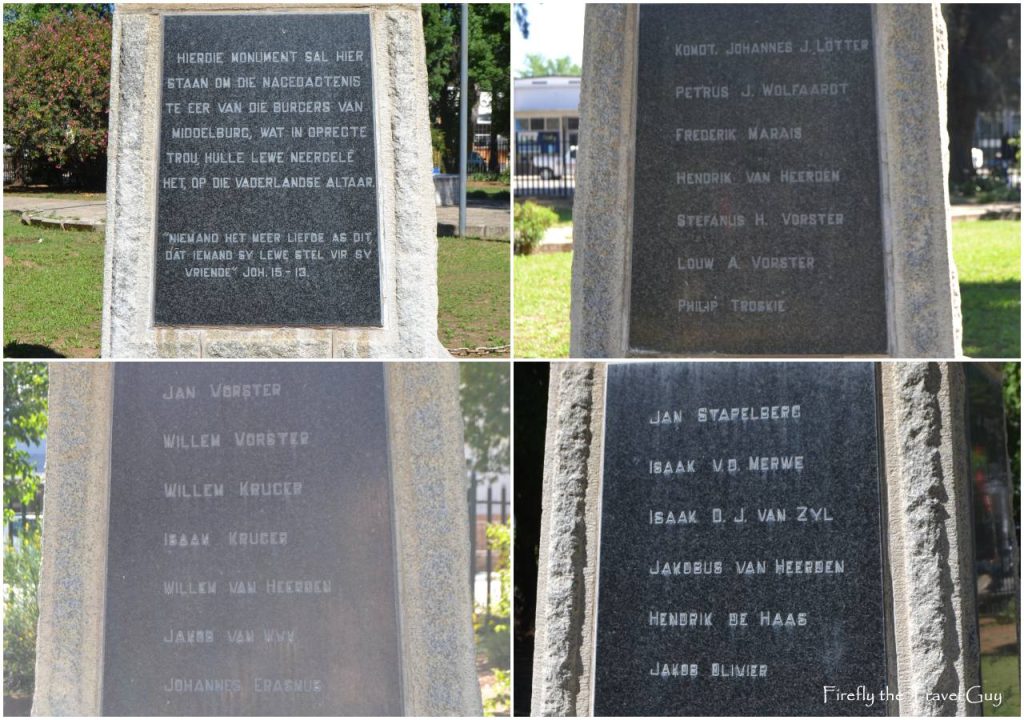 Inside are four monuments/items of historic importance, starting with the Burger Monument. This graceful obelisk was erected in 1929 to honour the memory of 20 Burghers who fell during the Anglo-Boer War. Among them count Commandant J. C. Lötter, and his right-hand man, Lieutenant Pieter Wolfaardt, both executed just outside Middelburg where the Stoel Monument stands.